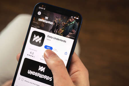 Kharkov, Ukraine - January 19, 2022: DOTA Underlords game app. Girl holding mobile phone with game and want to play. popular mobile games concept