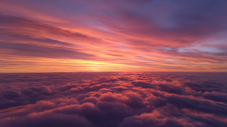 Beautiful aerial view above clouds at sunset. Panoramic view