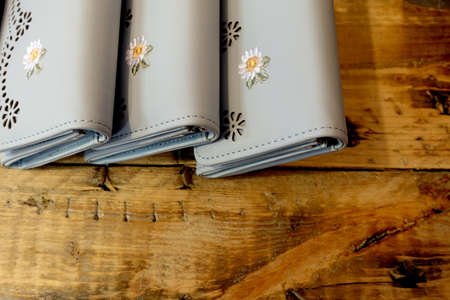 St Ives, Cornwall, UK - April 13 2018: Three small light blue, handbags or purses, with floral decorative pattern, on a rustic wooden background