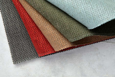Multi-colored samples of upholstery fabric for sofas and chairs close-up. Selection of fabric for interior decoration
