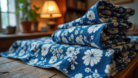 Stacked floral blankets on wooden table in cozy room with warm lighting. That the image is generated using AI.