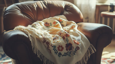 A cozy leather armchair with a colorful knitted shawl draped over it, illuminated by warm sunlight, creating a tranquil indoor atmosphere perfect for relaxation.