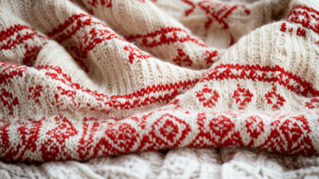 Cozy white red plaid blanket spread on soft surface, evoking warmth comfort, ideal for winter or holiday season settings.