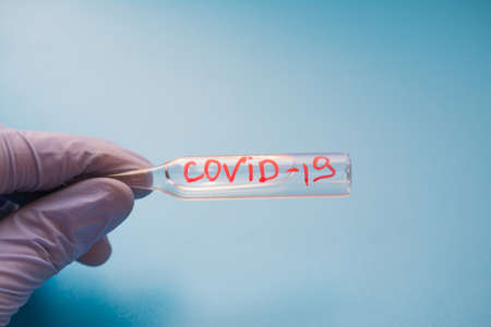 Hand in latex glove holding vial with label Covid-19 Ampoule on a blue background