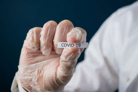 Closeup of a doctor wearing protective glove holding a Covid 19 sign. Conceptual image of public health threatening virus.