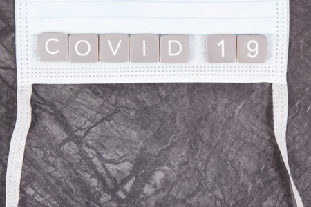 Inscription covid-19 with surgical or protective mask. Novel coronavirus outbreak. 2019-nCoV. Sars-CoV-2. Place for text