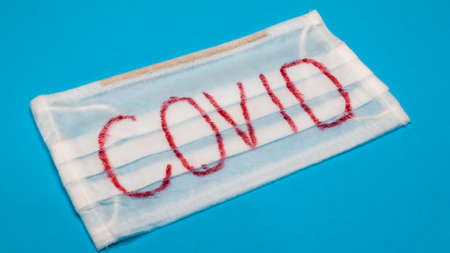 Typical white 3-ply surgical mask with rubber earhooks to cover mouth and nose with English block letters Covid on a blue background. Dangerous virus and quarantine concept