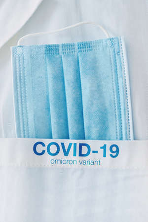 COVID-19 omicron variant, medical protective face mask in white coat pocket, closeup with selective focus