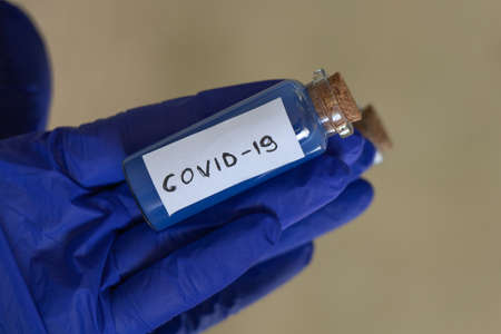 hand in blue gloves holds a test tube with a label and the inscription covid-19