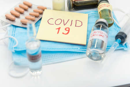 Coronavirus as danger disease. COVID-19 write on blue medical face mask and virus vaccine ampoule. Epidemic