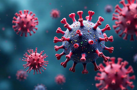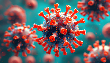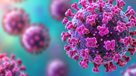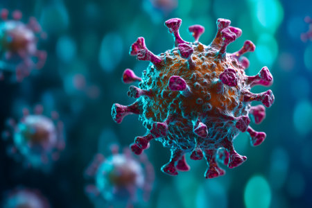 This vibrant 3D illustration showcases virus particles in a detailed microscopic view, highlighting their unique structures and textures against a blurred background, creating a dynamic visual experience