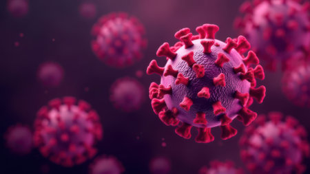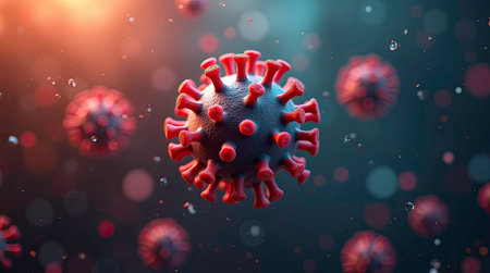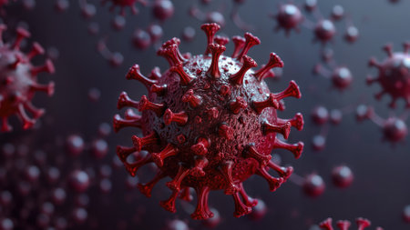 Realistic 3D rendering of a virus particle with red spike proteins on a dark background, representing infection, virology, and disease transmission