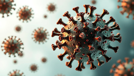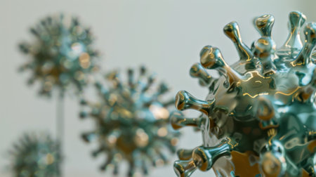 A detailed depiction of virus, showcasing its structure and spikes, emphasizing its microscopic features and health implications