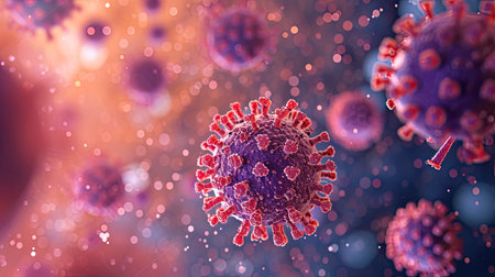 A vivid 3d depiction of a round pathogen with striking red protrusions, set against a gentle gradient of blue and purple hues for scientific and educational use.