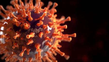 Detailed 3D illustration of a virus with prominent spike proteins set against a dark background, representing scientific concepts in health and biology.