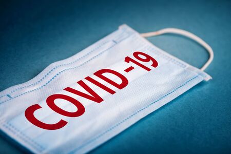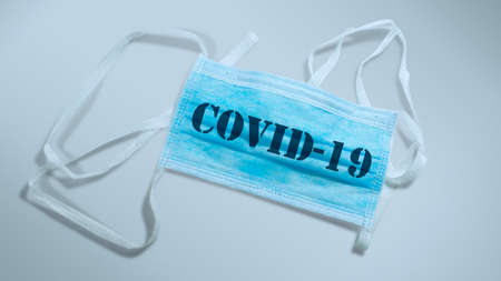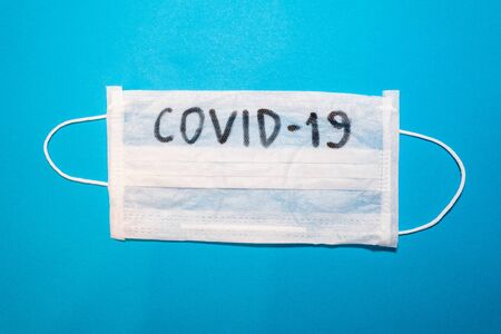 Typical white 3-ply surgical mask with rubber earhooks to cover mouth and nose with English block letters Covid-19 on a blue background. Dangerous virus and quarantine concept