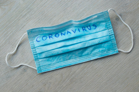 Coronavirus word written on a surgical medical mask. 2019-nCoV blue background.