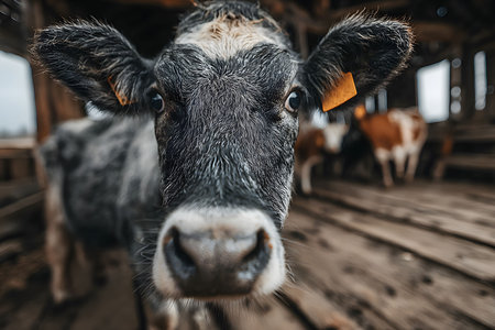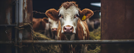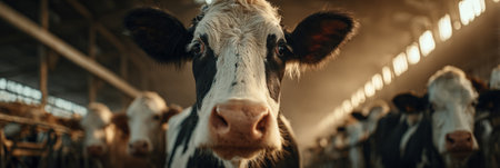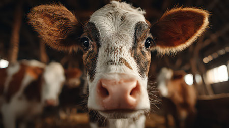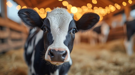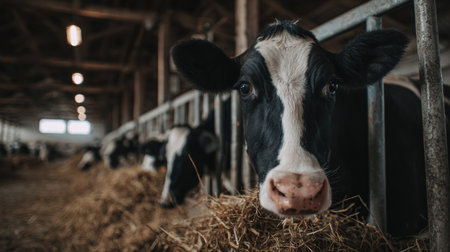 Close-up of a dairy cow in a well-lit barn, symbolizing modern agriculture and animal husbandry.