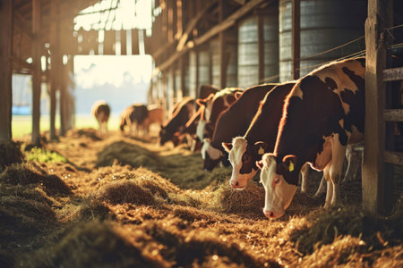 Agriculture industry, farming and animal husbandry concept - herd of cows eating hay in cowshed on dairy farm. Agriculture environment illustration. Generative AI art
