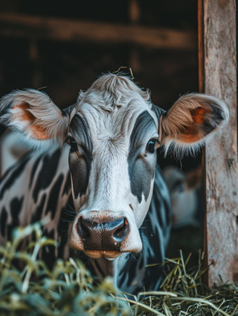 This close-up photograph captures the curious expression of a brown and white cow inside a rustic barn, showcasing the beauty of farm life and the serenity of rural landscapes.