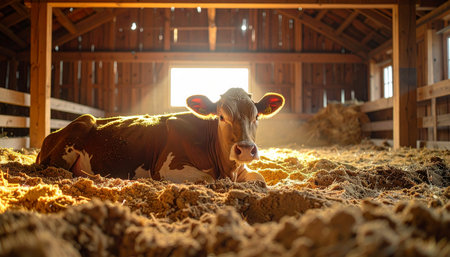 A moment of tranquility on the farm as a gentle cow rests comfortably in its stall. Warm morning sunlight streams through the barn door, casting a golden glow and creating a peaceful, idyllic atmosphere of rural life and animal welfare.