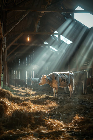 Three cows in a barn with sunlight streaming through rustic and warm atmosphere