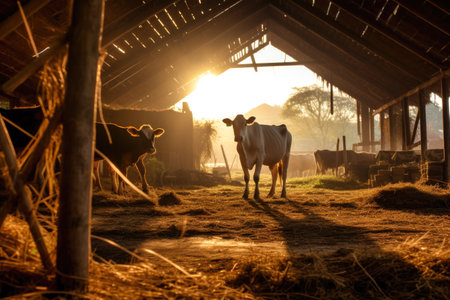 large village cowshed, cows standing inside cowshed illuminated morning sun, lot clean hay