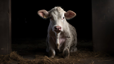 In the golden glow of the setting sun, a charming calf calf is lying calmly on the straw in the stable on the farm. Generative AI