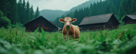 Experience rustic tranquility in this captivating barnyard scene A single cow graces the spotlight amidst lush greenery, aged wooden barns, and soft skies This peaceful rural landscape, ideal for pastoral themes or nature lovers, evokes a calming sense of tranquility Perfect for projects seeking a serene, agricultural touch AI Generative