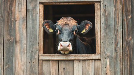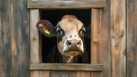 A dairy cow sticking its head through a barn window, playfully sniffing the air. The rustic wooden barn and farmyard provide a charming and friendly rural setting.