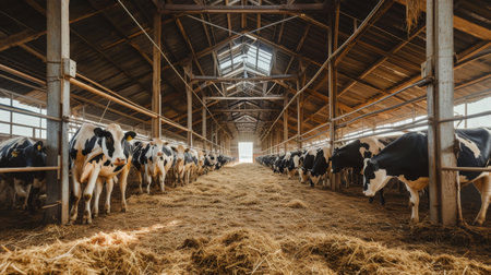 Dairy Cows Standing in Sunlit Barn .Generative AI