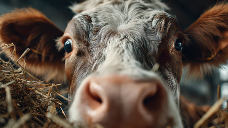 This close-up image captures the inquisitive expression of a brown cow in a barn, surrounded by hay. The soft details of its fur and expressive eyes evoke a sense of farm life.