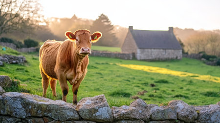 Gentle Morning Light A Red Devon Cow in Peaceful Pasture, Rustic Barn, and Calm Farm Scene