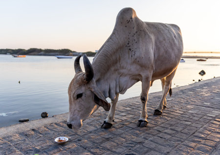 A close-up of a brown cow grazing on wild vegetation near the shoreline in Vlora, Albania, photographed on August 25, 2025