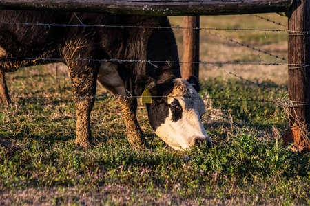 grazing cow eating blades of grass on a green pasture. Close-up of beef cattle grazing outside the farm in nature