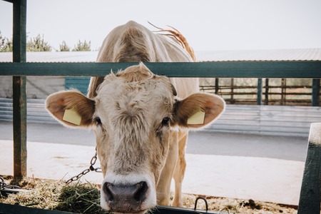 close up view of domestic beautiful cow grazing on field in countryside