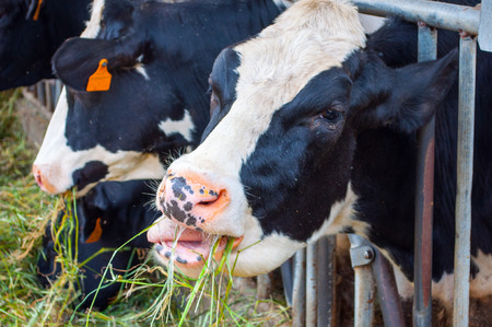 Milk cows on the farm are eating food dairy farm. Agriculture industry, farming and animal husbandry concept.