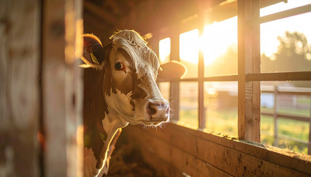 A gentle dairy cow peeks over a wooden stall in a rustic barn, bathed in the warm, golden light of a beautiful sunrise. The serene scene evokes feelings of peace, tranquility, and the simple beauty of rural farm life.