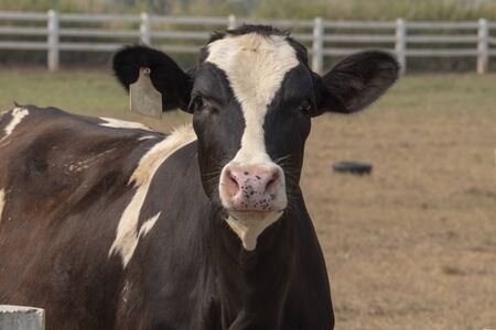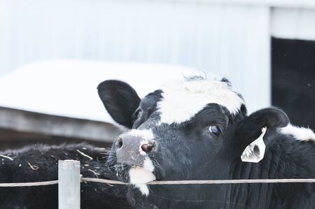 Nose and muzzle of young milk cow looking at you out of fence of cowshed