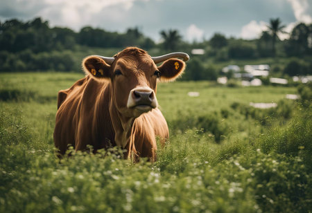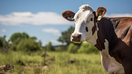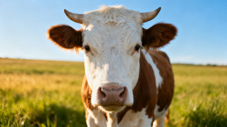 A charming young cow stands in a lush green meadow under a clear blue sky, evoking a sense of peace and tranquility in a rural landscape.