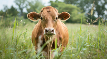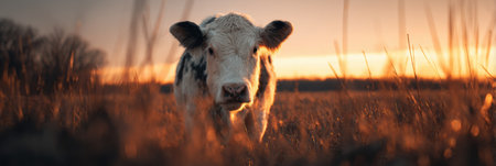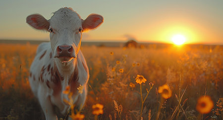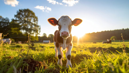 A curious young calf stands in a lush green pasture, bathed in the warm, golden light of a setting sun. Its innocent gaze connects directly with the viewer, evoking a sense of peace, tranquility, and the simple beauty of rural life and sustainable farming.