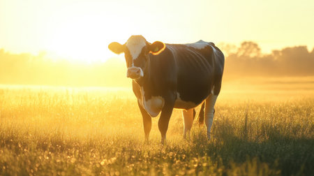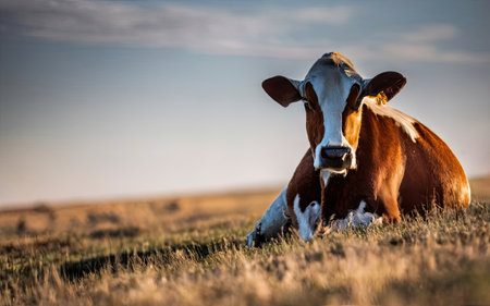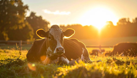 A peaceful dairy cow rests in a lush green pasture, bathed in the warm, golden light of a setting sun. The serene scene captures the tranquility of rural life and the simple beauty of nature at the end of the day.