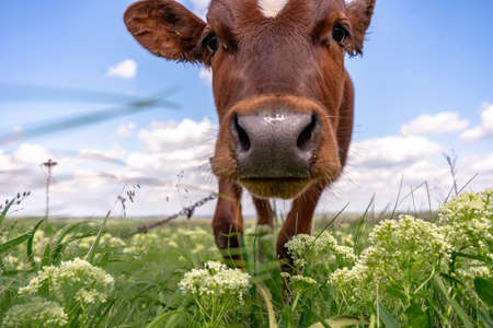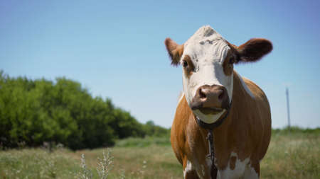 Funny cow grazes on a green lawn. Full face cow portrait. Cow farm.