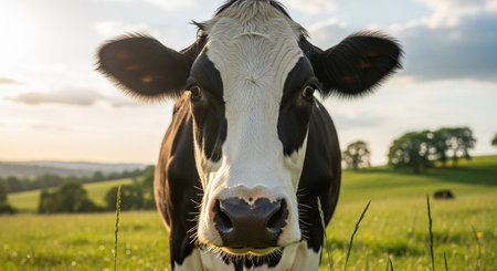Close up of black and white cow looking at the camera at sunset