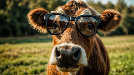 Cute cow wearing glasses lying in a field of yellow flowers, creating a whimsical and charming rural scene.