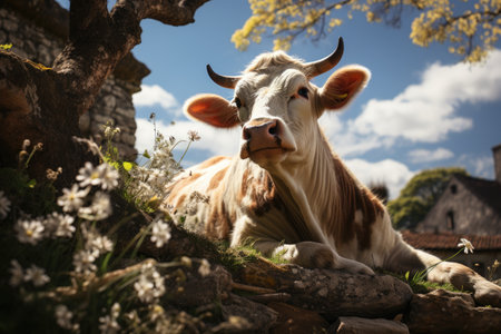 Generative AI, a contented cow in a springtime field