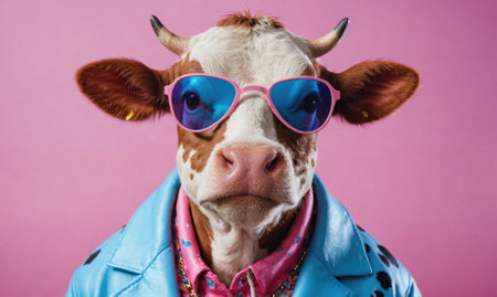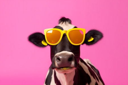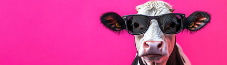 A humorous portrait of a cow wearing sunglasses against a bright pink backdrop