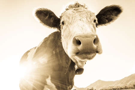 Closeup portrait of a cute friendly cow on a summer evening on a village countryside