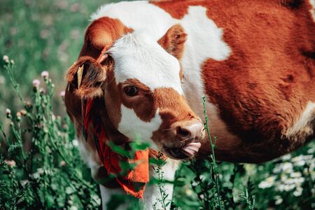 Brown and white little cow chewing and looking towars camera in Moldova