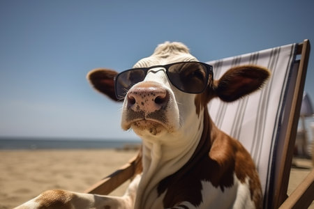 Image of a cow wearing sunglasses lying on chair on beach on a clear day. Farm animals. Illustration, Generative AI.